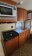 The kitchen includes a three-burner cooktop, a convection microwave, a double-door refrigerator with a stainless steel finish, and a round stainless steel sink with a cover. Theres also a pullout countertop extension for added workspace and storage under the dinette and sofa.