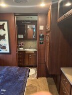 The kitchen includes a refrigerator, stove, and microwave, making meal prep easy wherever the road takes you. The bathroom includes a shower and toilet, providing the conveniences of home while traveling. Throughout the coach, thoughtful storage solutions ensure everything has its place.