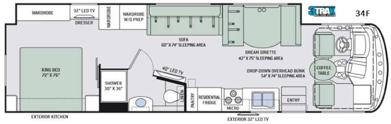 As you enter the Hurricane 34F Class A gas motor home by Thor Motor Coach, you will notice a full wall slide out along the drivers side that opens up this whole coach. Within the living area, there is a dream dinette, and a sofa along with overhead cabinets. Just beyond the sofa, there are two wardrobes, one that includes washer/dryer prep.