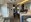 Moving toward the living area, the street-side includes a booth dinette that converts into a sleeping space, while the curb-side features a sofa with overhead cabinetry.