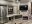 Inside, the living area is bright and open with large windows, residential-style lighting, and soft-touch furnishings. The entertainment center includes a fireplace and a large LED TV positioned across from theater seating and a tri-fold hide-a-bed sofa.