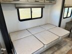 The floorplan is built around a front 60 x 80 queen bed (set up as a Murphy bed in some layouts) with storage around it and a large front window in many units. The main living area has a slide with seating (sofas or sofa plus dinette, depending on configuration) facing the entertainment area, and an Lshaped counter with a couple of bar stools acting as extra prep space and eating area. The trailer is only about sevenplus feet wide, so walkway space is tighter than in fullwidth models, but it also feels less bulky to tow and park.