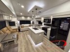This unit is perfect for your family that needs sleeping space for eight! There is ample seating with a sliding desk/dining table, 62 theater seating, and a 72 tri-fold sofa along the rear wall. You can easily relax and enjoy the telescoping TV with a cozy fireplace below. The kitchen offers all that you need to prepare and cook meals just like home with a 16 cu. ft. refrigerator for your perishables, a 30 residential microwave oven, and three burner range top and oven. You will lovethe kitchen island all outfitted with pull-out pet bowls and double pull out trash bins with an integrated Stow & Go paper towel holder. There is also an 84 pantry with adjustable shelves for all of your canned and dry goods. Mid-coach, just ahead through the main entry, is a bonusroom that can be used as a bedroom featuring a sofa bed with flip-up overhead bunk and trundle below, or an office with pull-out desk so that you can work easily while you travel, or it could also be used as a gaming room since there is also a 50 Smart TV. Head up the steps to a bathroom on your left and a private master suite with king bed slide all the way up front. A sliding dresser top features hidden storage which is perfect for jewelry and other personal belongings. The front wardrobe features mirrored doors and the corner closet has been prepped for a stackable washer and dryer if you choose to add that option.