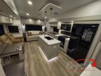This unit is perfect for your family that needs sleeping space for eight! There is ample seating with a sliding desk/dining table, 62 theater seating, and a 72 tri-fold sofa along the rear wall. You can easily relax and enjoy the telescoping TV with a cozy fireplace below. The kitchen offers all that you need to prepare and cook meals just like home with a 16 cu. ft. refrigerator for your perishables, a 30 residential microwave oven, and three burner range top and oven. You will lovethe kitchen island all outfitted with pull-out pet bowls and double pull out trash bins with an integrated Stow & Go paper towel holder. There is also an 84 pantry with adjustable shelves for all of your canned and dry goods. Mid-coach, just ahead through the main entry, is a bonusroom that can be used as a bedroom featuring a sofa bed with flip-up overhead bunk and trundle below, or an office with pull-out desk so that you can work easily while you travel, or it could also be used as a gaming room since there is also a 50 Smart TV. Head up the steps to a bathroom on your left and a private master suite with king bed slide all the way up front. A sliding dresser top features hidden storage which is perfect for jewelry and other personal belongings. The front wardrobe features mirrored doors and the corner closet has been prepped for a stackable washer and dryer if you choose to add that option.
