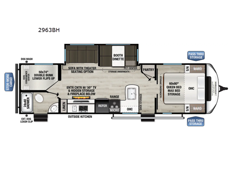 This is a popular bunk trailer for a larger family thanks to having the convenience of dual entry doors allowing access to the main living and kitchen area and near the front bedroom, and into the full bathroom for a quick in and out when playing outside. The bathroom also includes a hamper for convenience. The Stor-More cargo door allows you to place items from the exterior to the interior under the lower flip bunk for safe travels to your destinations and back home. The kids will surely love the convenience centers when playing or sleeping in a bunk. There is a sofa and booth dinette slide including a pet center for relaxing and feeding your pet. The kitchen includes full amenities plus a pantry to store lots of goodies for everyone. Along the exterior, the outside camp kitchen will come in handy when you have everyone at the campsite for dinner and the 18awning offers some protection from the elements.
