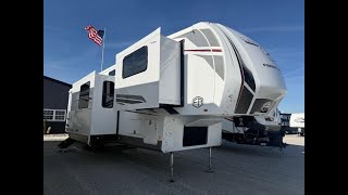 This fifth wheel is packed with features to make each trip enjoyable! The middle kitchen might be your favorite room with wrap-around counter space, a pantry, and a 16 cu. ft. 12V refrigerator for food storage. You can dine at the hi-top table and chairs here, or sit in the front living area on the dual sofas and theater seating! This area can become your guests bedroom at night since there are dual opposing slides and wardrobe storage for their things. You will also find a full-length wardrobe in the rear private bedroom, along with a king bed slide out, plus washer and dryer prep! And of course there is a full bath so everyone can stay clean each day!