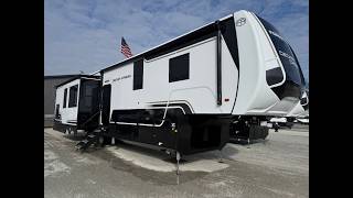 A front kitchen with ample counter space, a middle den, and a front bedroom make this fifth wheel one to remember! The living area will be a favorite spot to visit together since there is a hide-a-bed sofa and theater seating, plus an entertainment center with a fireplace. There is also a free-standing dining table and a desk with a chair if you need to telecommute. Your guests will love the middle den with a hide-a-bed sofa and a closet for their things, plus there is a loft above this room for added sleeping or storage space. A spacious full bath includes a shower with a seat, and the king bed slide out in the front private bedroom is sure to bring a great nights rest.