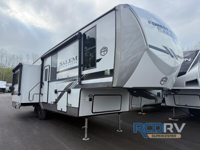 The Salem Hemisphere fifth wheels by Forest River are packed with features, while still being value-minded! Each model is constructed with laminated Aluma Frame sidewalls and floor with block foam insulation plus full-length barreled ceilings for added head space. There are LED awning, marker and taillights outside, along with an extra-large pass-thru storage with slam latch baggage doors, plus solar prep and Lippert On-The-Go ladder prep. The 60K on-demand tankless water heater will provide endless hot showers, and the JBL sound system includes a head unit plus interior and exterior speakers to keep the party going. There are also many interior comforts found throughout that will make you feel right at home!
