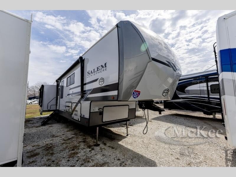 The Salem Hemisphere fifth wheels by Forest River are packed with features, while still being value-minded! Each model is constructed with laminated Aluma Frame sidewalls and floor with block foam insulation plus full-length barreled ceilings for added head space. There are LED awning, marker and taillights outside, along with an extra-large pass-thru storage with slam latch baggage doors, plus solar prep and Lippert On-The-Go ladder prep. The 60K on-demand tankless water heater will provide endless hot showers, and the JBL sound system includes a head unit plus interior and exterior speakers to keep the party going. There are also many interior comforts found throughout that will make you feel right at home!