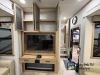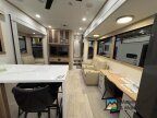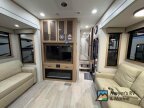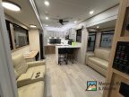 This fifth wheel is packed with convenient features to make your travels more comfortable and enjoyable! The master bedroom includes a king bed slide out with USB ports on either side of the bed so you both can charge your phones, and there is a dresser for your folded clothes. You will love the front bathroom with dual bath sinks, a fiberglass one-piece shower, plus a walk-in closet with shelves and rods to hang clothes! There is a unique middle utility room with washer and dryer prep if you want to add these, a Washer and dryer counter and a rod to hang clothes that will make a perfect laundry room, or you can utilize this space for storage! Head to the main living area to relax on the theater seating or hide-a-bed sofa, and if you have guests stay over, they can sleep here. There is also an entertainment center with a 50 flat screen TV, but you might just leave that off if youre working at the desk with a chair that is provided. Weve saved the best part for last, the kitchen! Here, youll find ample counter space to prep home-cooked meals, a three-burner range with a 24 oven, plus a large counter with barstools where you can enjoy breakfast at each morning. Choosing this fifth wheel is a no-brainer!