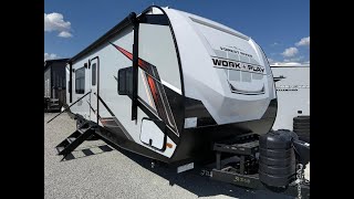 Each Work and Play toy hauler by Forest River is built tough with a mega rail powder coated chassis, a one-piece Tufflex PVC roof membrane, and a fiberglass front cap with rock guard. Towing is made hassle-free with the heavy duty Dexter axles with Nev-R-Adjust brakes and nitrogen filled tires. You will find many convenient features, such as a Winegard Air 360 and TV antenna, an outside spray port, and magnetic compartment door catches to store your riding gear. These toy haulers also include shaker style cabinets and doors, a residential bedspread, multiple USB ports for all your electronics, and many more amenities!