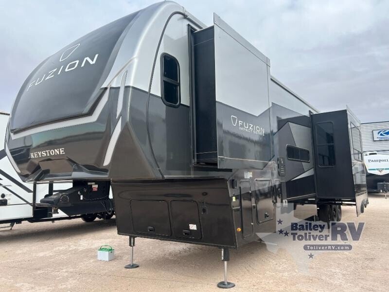Embrace the great outdoors with a Fuzion Impact Edition toy hauler by Keystone! There are laminated fiberglass sidewalls and a 8 4 wide-body construction for your toys and gear! The one-piece polypropylene heated underbelly includes enclosed tanks and valves which will help extend your camping season, and the leaf spring suspension system will provide smooth towing. Head inside to enjoy night shades, hardwood cabinetry, and fiberglass backed linoleum floor with no carpet for easy cleaning. Each model also includes a Girard on-demand water heater, two 30 lb. LP tanks, recessed LED puck lighting throughout, and the list of comforts goes on!