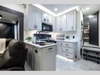 If you enjoy long trips with family and friends, this fifth wheel is sure to meet all of your needs! There is a private bedroom with a king bed slide-out for more space and comfort, plus a front wardrobe. And you will be amazed by the lovely full bathroom behind the barn door next to the bedroom with a double vanity for you and your partner! The living room is made spacious thanks to the dual opposing slides, and youll find a sectional sleeper sofa here, as well as desk/dinette for meals and even work. And dont overlook the kitchen area with ample counter space, a four burner range, an accessory sink and a French door 12V refrigerator! If you thought it can t get better, wait until you see the front room that will be the best place to relax and hang out, featuring a sleeper sofa, bunks above, and an entertainment center with a projector for a movie marathon.