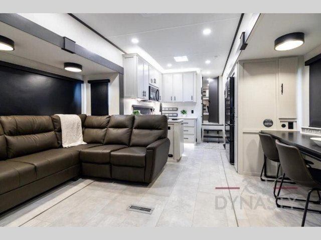 If you enjoy long trips with family and friends, this fifth wheel is sure to meet all of your needs! There is a private bedroom with a king bed slide-out for more space and comfort, plus a front wardrobe. And you will be amazed by the lovely full bathroom behind the barn door next to the bedroom with a double vanity for you and your partner! The living room is made spacious thanks to the dual opposing slides, and youll find a sectional sleeper sofa here, as well as desk/dinette for meals and even work. And dont overlook the kitchen area with ample counter space, a four burner range, an accessory sink and a French door 12V refrigerator! If you thought it can t get better, wait until you see the front room that will be the best place to relax and hang out, featuring a sleeper sofa, bunks above, and an entertainment center with a projector for a movie marathon.