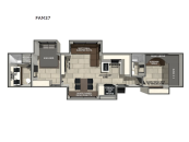 If you enjoy long trips with family and friends, this fifth wheel is sure to meet all of your needs! There is a private bedroom with a king bed slide-outfor more space and comfort, plus a front wardrobe. And you will be amazed by the lovely full bathroom behind the barn door next to the bedroom with a double vanity for you and your partner! The living room is made spacious thanks to the dual opposing slides, and youll find a sectional sleeper sofa here, as well as desk/dinette for meals and even work. And dont overlook the kitchen area with ample counter space, a four burner range, an accessory sink and a French door 12V refrigerator! If you thought it cant get better, wait until you see the front room that will be the best place to relax and hang out, featuring a sleeper sofa, bunks above, and an entertainment center with a projector for a movie marathon.